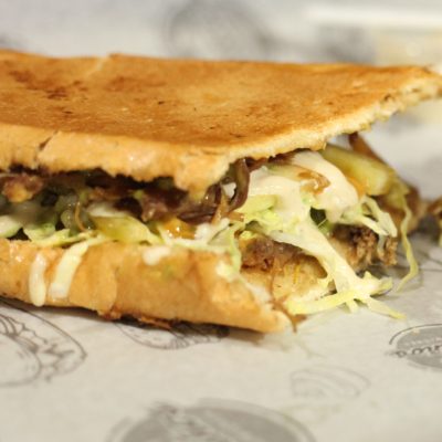 Jamón de cordero, queso crema, tomate, lechuga, salsa de ajo.
