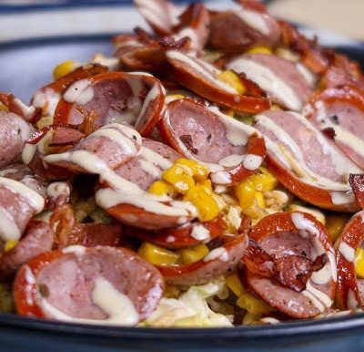 Papa criolla, salchicha, salsas y queso gratinado.