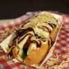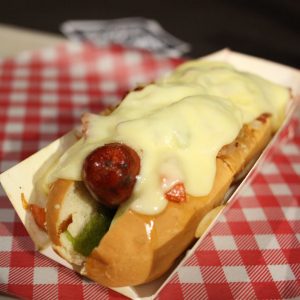 Salchicha americana, ripio de papa, queso crema, cebolla, tocineta, salsa de ajo, salsa tejana.