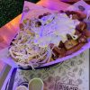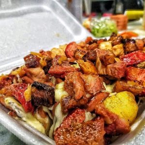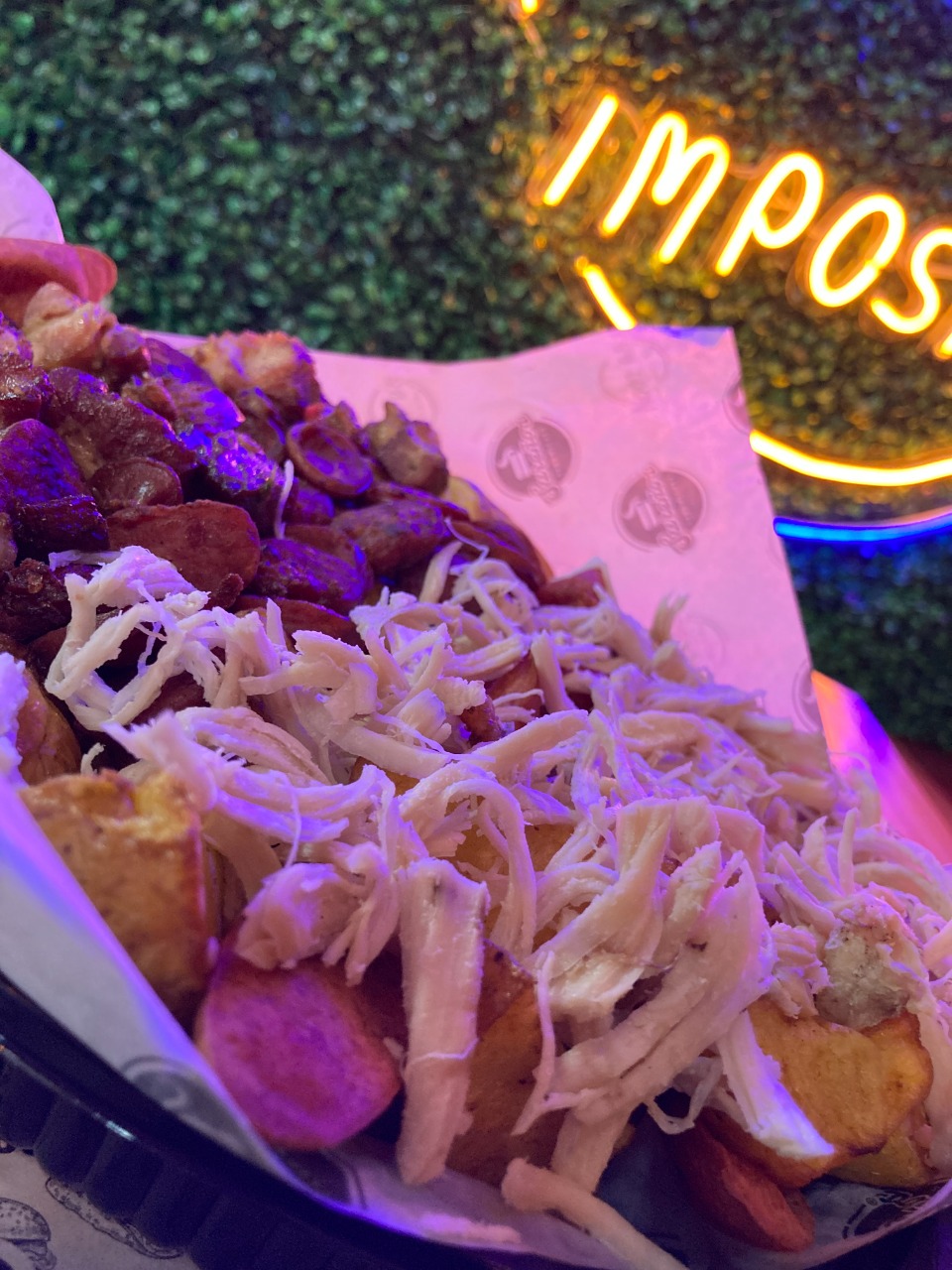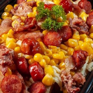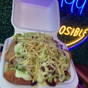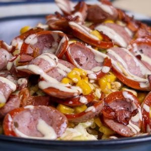 Papa criolla, salchicha, salsas y queso gratinado.