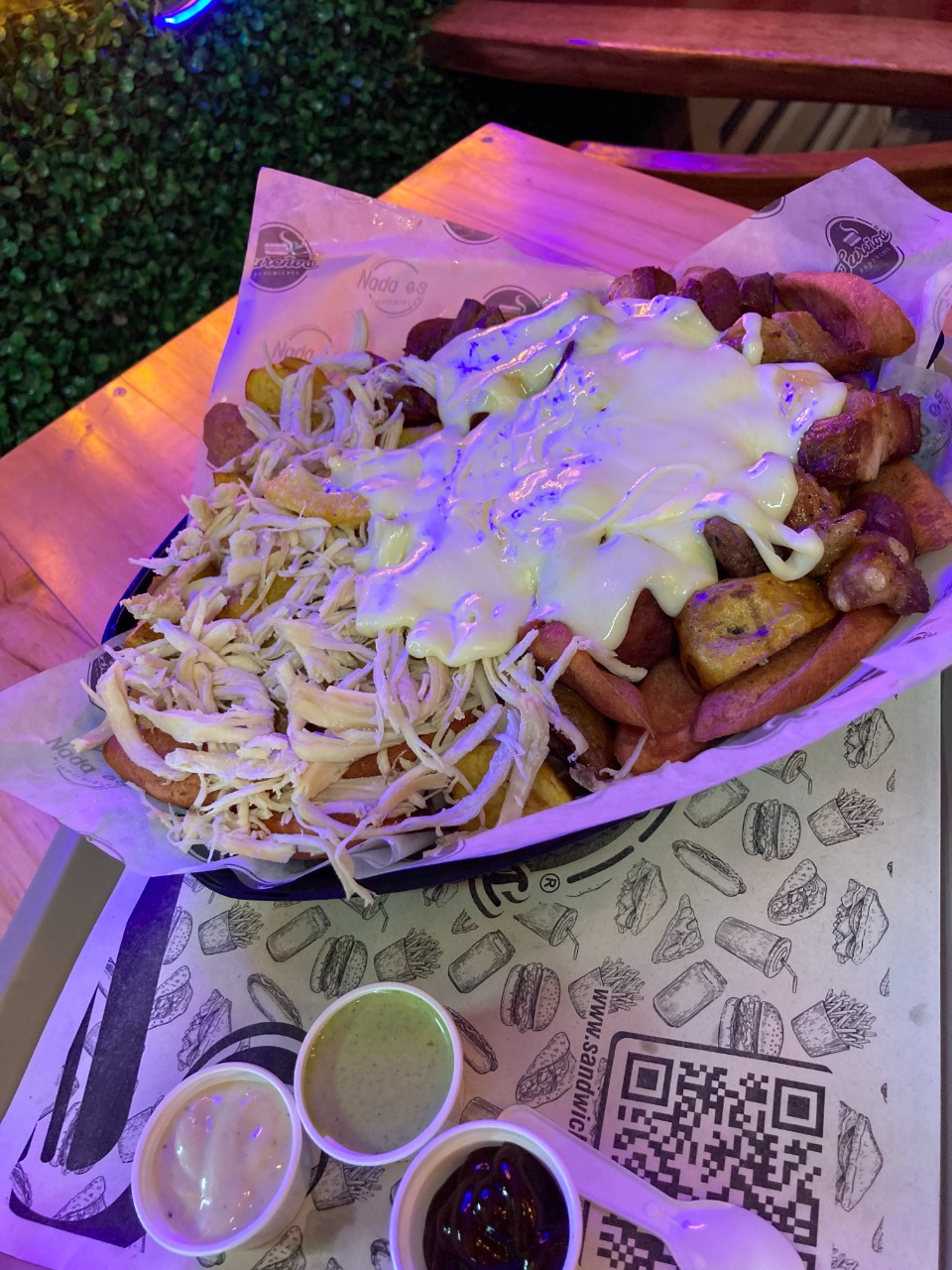 Papa criolla, salchicha, chorizo, costilla, salsas, queso gratinado, pollo o carne desmechada
